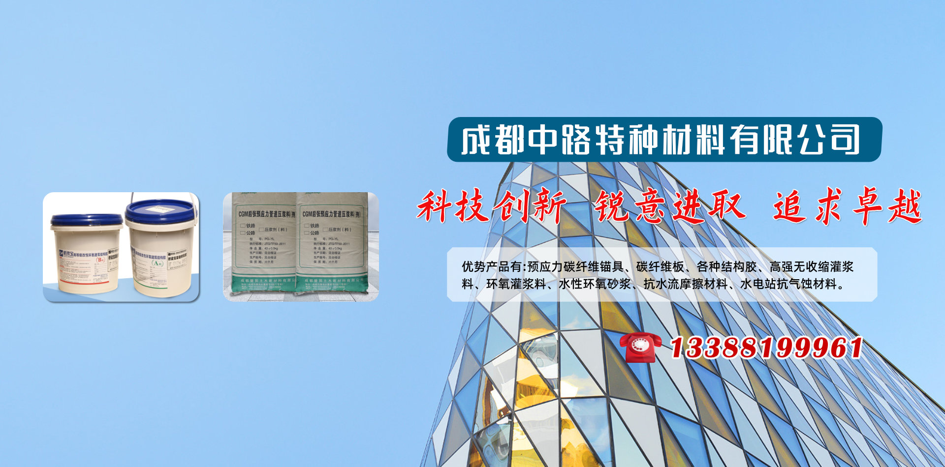 成都中路特種材料有限公司借助清華大學高分子材料學科、晨光化工研究院、西南交通大學、四川交通職業(yè)技術(shù)學院科研技術(shù)平臺成為一家集新材料研發(fā)、銷售、技術(shù)服務和施工于一體的專業(yè)服務公司,優(yōu)勢產(chǎn)品有:預應力碳纖維錨具、碳纖維板、各種結(jié)構(gòu)膠、高強無收縮灌漿料、環(huán)氧灌漿料、水性環(huán)氧砂漿、抗水流摩擦材料、水電站抗氣蝕材料和研發(fā)各種特殊用途膠黏劑產(chǎn)品地處西南腹地成都,業(yè)務覆蓋四川各大中小城市、重慶、云南、昆明、新疆、西藏等區(qū)域。產(chǎn)品涵蓋各種加固施工材料、施工設備及施工配件,品牌有威士邦等aa進口品牌,同時批發(fā)銷售國產(chǎn)高、中、低端品牌,為客戶提供全面參考。 成都中路特種材料有限公司為您提供加固行業(yè)的一站式服務! 如果您面對建筑物加固,不知如何下手,我們將針對您的項目情況,提供全面的技術(shù)指導咨詢,甚至為您量身定做加固方案;如果您面對項目要求,不知如何購買加固材料,我們將根據(jù)您的需要,提供多種參考,從進口品牌、國內(nèi)知名品牌到低端產(chǎn)品,一應俱全; 如果你萬事俱備,不知何處尋找施工人員,我們可以為您提供具有多年加固經(jīng)驗的專業(yè)隊伍;中路特種材料致力于為客戶提供全方位的建筑物加固解決方案。 成都中路特種材料有限公司是一座橋,一座連接廠家與用戶的橋,以質(zhì)量求生存,以信譽圖發(fā)展,成都中路特種材料有限公司期望用真摯的服務筑起一座客戶信任之橋。   科技創(chuàng)新 銳意進取 追求卓越!        熱忱歡迎業(yè)內(nèi)專業(yè)人士加盟合作!